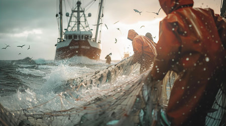 A serene shot of a fishing trawler at dawn, casting nets into the water, highlighting the connection between humans and the ocean's bounty.