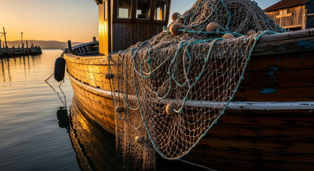 fishing gear and equipment on trawlers deck at dusk, created with generative ai