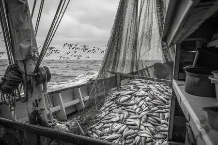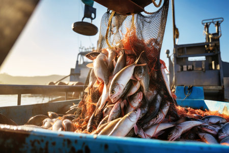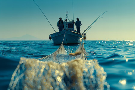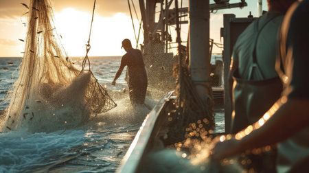 A serene shot of a fishing trawler at dawn, casting nets into the water, highlighting the connection between humans and the ocean's bounty.