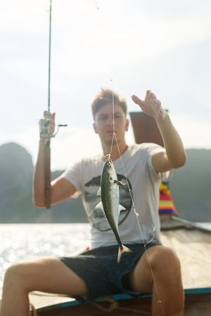 fisherman holding tuna fish on hand with hook on the boat in andaman sea