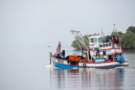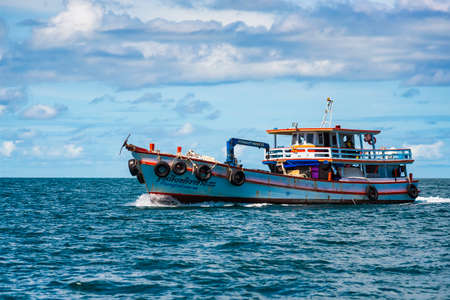 Krabi, THAILAND - June 28, 2020: Local fishing boats departure from Krabi to catching fish in the Andaman sea.