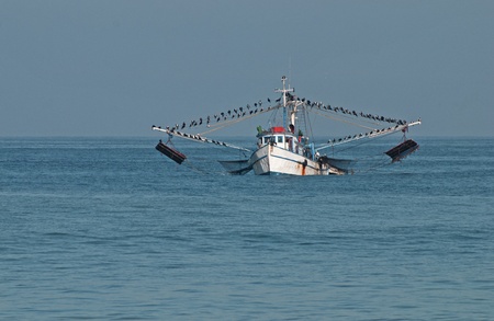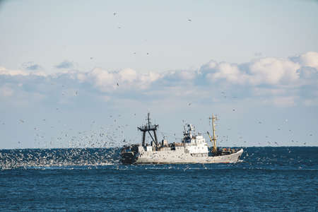 Fishing trawler in the sea with seagulls