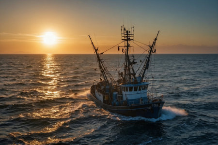 A fishing trawler navigating through calm seas in the early morning, with seagulls flying overhead and the soft glow of sunrise on the horizon.