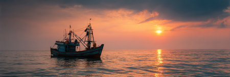 A fishing boat floats serenely in calm waters during sunset, bathed in warm light, while clouds add depth to the sky above, creating a tranquil atmosphere.