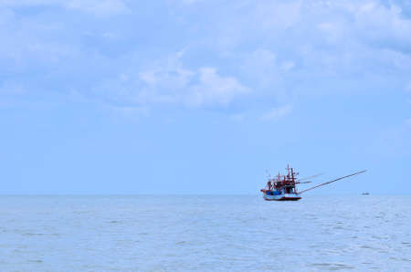 One fisherman boat in a sea blue sky background