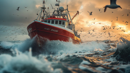 A rugged fishing boat cuts through turbulent ocean waves under a dramatic overcast sky, showcasing the resilience of maritime workers. AIG41