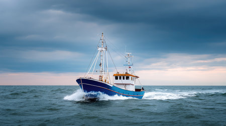 A fishing boat cuts through turbulent waters under a dramatic sky, with dark clouds and a serene horizon, capturing the essence of maritime adventure at sea.