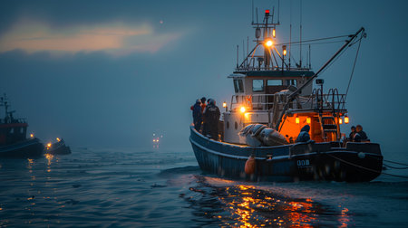 Fishermen aboard a vessel in a misty harbor, illuminated by work lights and a sense of camaraderie.
