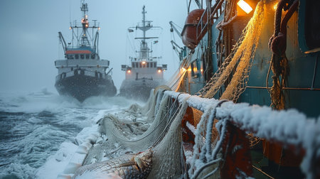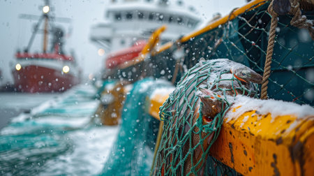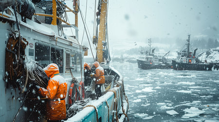 Fishermen brave the icy waters, as snow falls around their trawler in a frigid yet lively marine scene.