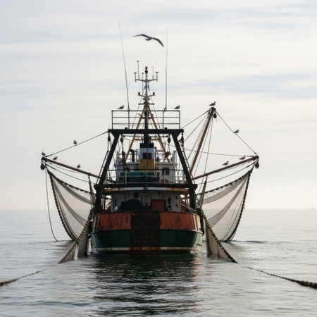 A dynamic shot of a large fishing trawler working in the open ocean, with nets being cast into the water and seagulls flying overhead, emphasizing the active maritime environment.
