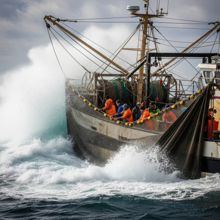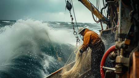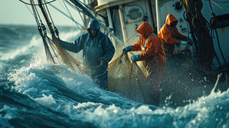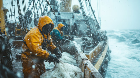 Fishermen braving harsh weather on a fishing boat, showcasing dedication amid stormy waves. The image illustrates the challenges of marine work and teamwork.