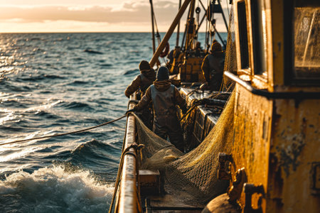 Fishermen on a commercial fishing boat haul in a net, working amidst the choppy ocean waves at dawn.