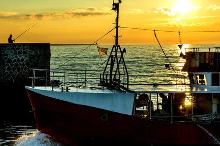 Homecoming: Tired fishermans ship approaching after a hard day. Rewal, Baltic Sea, Poland