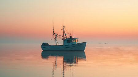 A fishing boat floating gently on calm waters at sunrise, with plenty of open space in the sky for adding text.