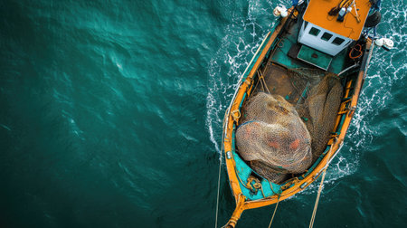 A top view of a fishing boat with nets and catch visible, with a clean, unobtrusive background for adding text.