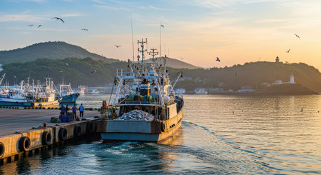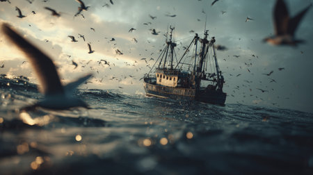 A fishing boat in the morning light, surrounded by birds, showcasing the beauty of nature and the fishing industry.