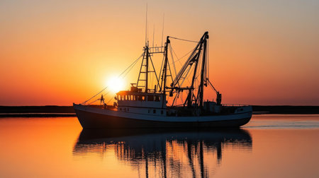Silhouette of a fishing boat against a blazing orange sunrise, casting shimmering reflections on the peaceful water surface.