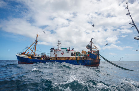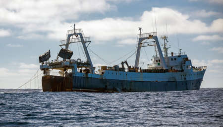 Fishing vessel lifts a trawl tackle off the southern tip of Africa. A large fishing trawler is engaged in industrial fishing of fish and seafood in the ocean.