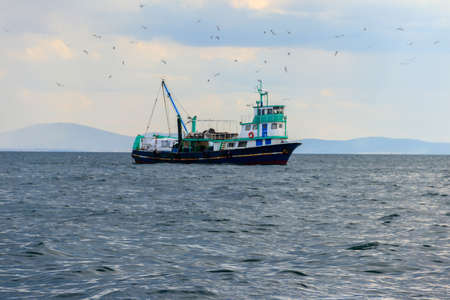 Commercial fishing trawler boat on the mediterranean sea surrounded by gulls