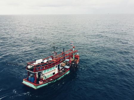 overhead drone view of fishing trawler at dusk, created with generative ai