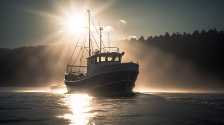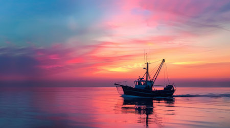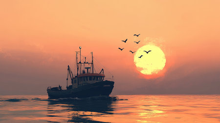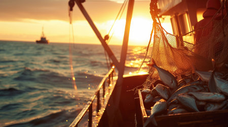 The golden hues of dawn cast over a fishing boat and its sprawling nets, weaving a tapestry of industry and nature at sea
