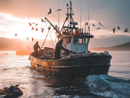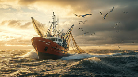 commercial fishing vessel in cold sea hauling large nets full of fish, with seagulls circling around. Bright reflections on water highlight dynamic maritime activity and daily seafood industry routine