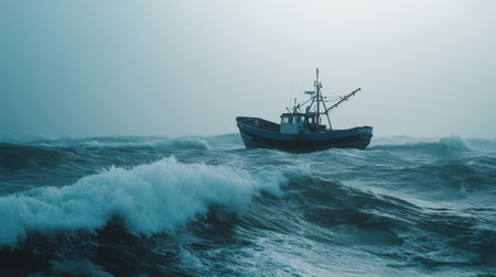 A lone fishing boat navigates through turbulent ocean waves on a stormy day, capturing the essence of maritime adventure and resilience in nature.