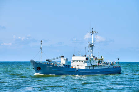 Baltiysk, Kaliningrad oblast, Russia - 07.22.2021 - Survey vessel, research vessel patrol boat sailing in bright blue Baltic Sea. Navy patrol vessel. Military ship, warship, Baltic Fleet, Russian Navy