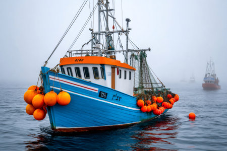 Small fishing boat sailing on a foggy day with fishing nets and orange buoys hanging on its side