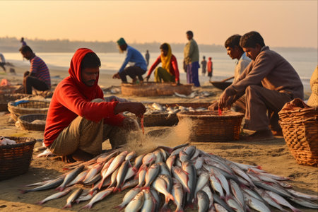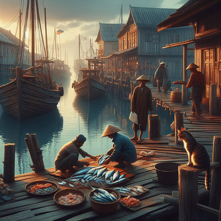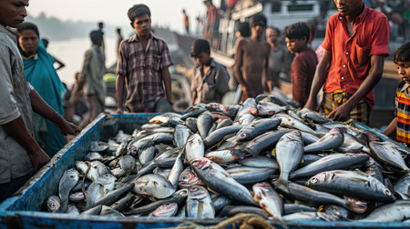 A fisherman sorting his catch by the riverside in the early morning light, showcasing traditional fishing practices in a serene natural setting