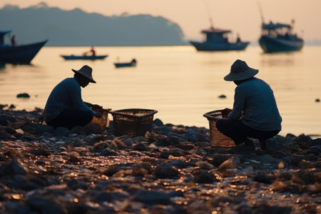 A fisherman fishing net harbor sunset boat silhouette sea dock coastal village calm mood fisherman gather dock sunset near sea harbor boat