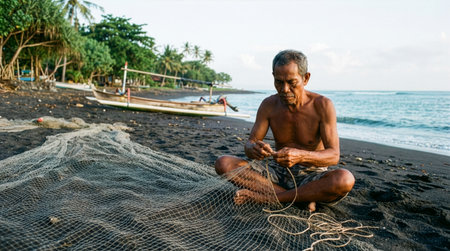 A serene portrait of a fisherman seated by the shoreline, wearing a straw hat and surrounded by fishing nets, perfectly capturing a peaceful coastal lifestyle.
