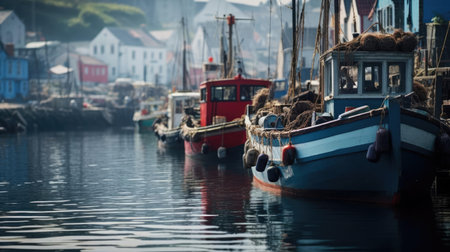 A serene harbor scene featuring fishing boats nestled against the dock, surrounded by colorful fishing gear, reflecting the essence of coastal life and maritime industry.