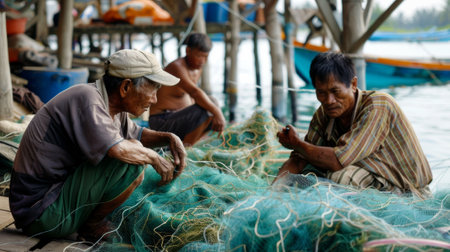 A Mature fisherman mending fishing nets on dock, showcasing weathered hands and focused expression