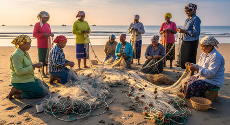 A group of women sits on a sandy beach, working together to mend large fishing nets. With fishing boats visible in the ocean background, the scene highlights traditional coastal labor and community cooperation in the morning light.