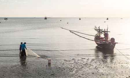 Fisherman life in the morning, Two fishermen keep fishing net in the coast