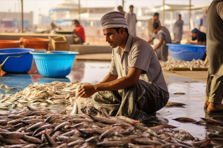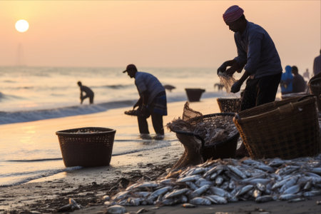 A seasoned fisherman sits on the beach next to his wooden boat laden with freshly caught fish, embodying the essence of coastal livelihood and tradition.