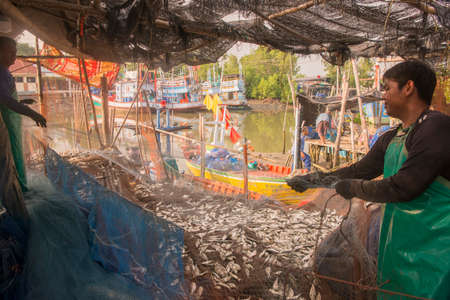 CHONBURI, THAILAND - DEC 9 : Group of fishermen clear fish from net on 9 December 2016 in Bangpra, Sriracha, Chonburi, Thailand