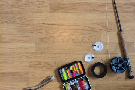 Fishing flat lay background with a copy space. Fishing gear on a wooden table.
