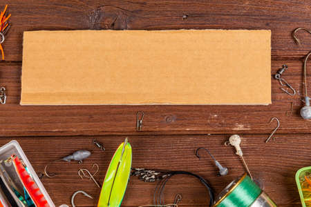 Fishing tacles on wooden background. Mockap for advertisment and publishing.