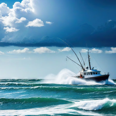A rugged fishing boat cuts through turbulent ocean waves under a dramatic overcast sky, showcasing the resilience of maritime workers. AIG41