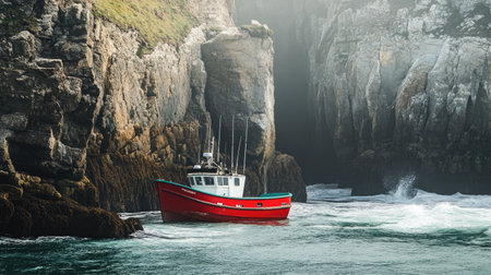 A vibrant fishing boat rests in coastal waters, surrounded by majestic rocky cliffs and a misty atmosphere, symbolizing maritime tranquility and exploration.