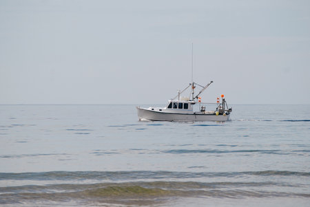 Fishing boat, trawler fishing Razor fish in an open Irish sea. Food industry, traditional craft, environmental damage concepts.