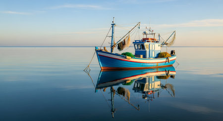 A colorful traditional fishing trawler floats on the perfectly calm sea at sunrise, creating a stunning mirror-like reflection on the water's surface. The peaceful and serene scene captures the beauty of maritime life and the tranquility of the open ocean.