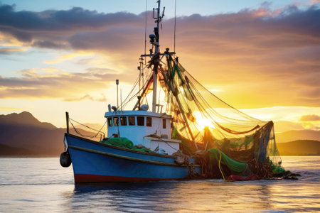 The golden hues of dawn cast over a fishing boat and its sprawling nets, weaving a tapestry of industry and nature at sea