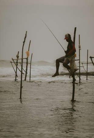 Traditional Stilt fishermen holding a fishing rod, and a bag for collecting fish, sitting on a stick cross above the seawater surface patiently waiting for fish to taking the bait.