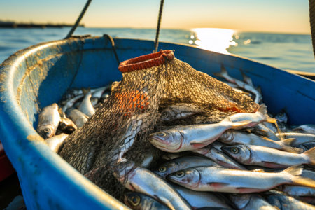 A fisherman with a fresh catch of fish in a net, on a boat at dawn. Evokes tradition, sustainable seafood, and the serene beauty of coastal life.