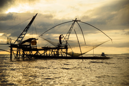 Silhouette of a fisherman working on giant square fishnet at Pakpra, Phtthalung province, Thailand.