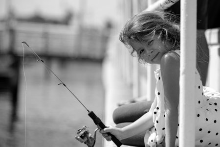 Funny little child girl catch a fish by a fishing rod.