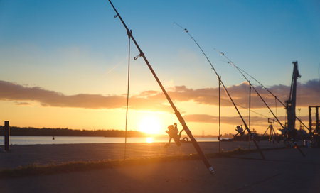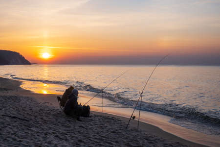 A relaxing sport, fishing on a European beach, at night when the sun is setting. Rods set up with the lines in the open calm sea.